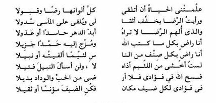 ثقف نفسك A Twitteren علمتني الحياة أن أتلقى كل ألوانها رضا وقبولا ورأيت الرضا يخفف أثقالي ويلقي على المآسي سدولا والذي ألهم الرضا لا تراه أبد الدهر حاسدا أو