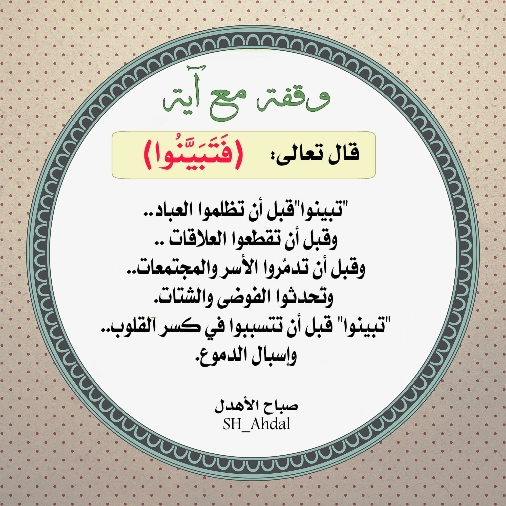 صباح بنت هاشم الأهدل En Twitter قال تعالى فتبينوا تبينوا قبل أن تظلموا العباد وقبل أن تقطعوا العلاقات وقبل أن تدمروا الأسر والمجتمعات وتحدثوا الفوضى والشتات تبينوا Https T Co Xflwwo5yqn