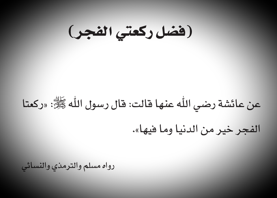 حديث خير من الدنيا وما فيها الكاتب Berkani Hm عن عائشة رضي الله عنها عن النبي صلى الله عليه وسلم قال ركعتا الفجر خير من الدنيا وما فيها رواه مسلم وفي رواية لهما أحب إلي من الدنيا جميعا معاني المفردات ركعتا الفجر أي سنته الراتبة خير من الدنيا خير من متاع